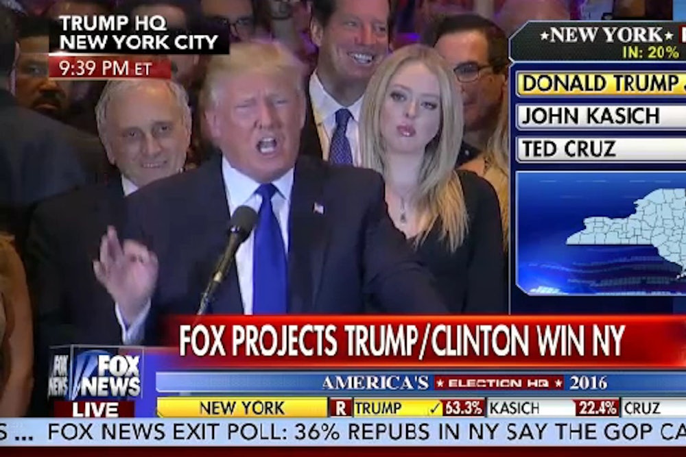 In his victory speech in New York on Tuesday night, Trump referred to “Senator Cruz.” This displayed a newfound maturity, according to political reporters across the cable news networks, because Trump didn’t call his opponent “Lyin’ Ted.” On CNN, Dana Bash said it was “a fundamentally different Trump.” NBC News’ Chuck Todd tweeted, “Trump stayed on ‘rigged’ message again. And kept his remarks short. The discipline is holding. The #stopTrump folks are in DEEP trouble.” On Fox News, even Trump’s nemesis, Megyn Kelly, said Trump was possibly “sounding—you tell me—more presidential.”