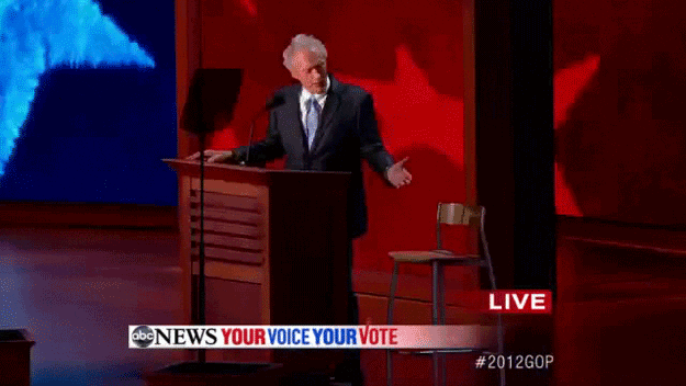 Then in 2012, Mitt Romney’s aides allowed Clint Eastwood to give an extemporaneous prime time speech, during which he conversed with an empty prop chair like a grand old man of the psych ward. Thanks to some sloppy advance work, the term “Eastwooding” is now commemorated on urban dictionary as “the act of speaking to an empty chair.”