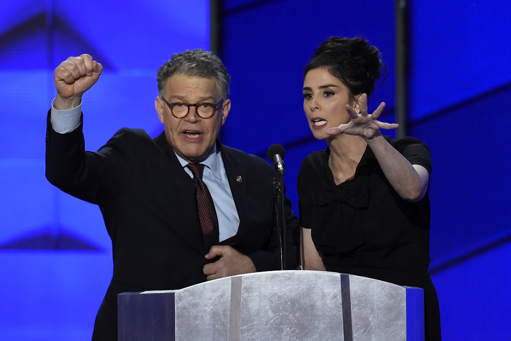 Until Sarah Silverman went on stage, that is. Silverman’s speech hit a note speakers have struggled to so far: She spoke convincingly and earnestly about having supported Bernie Sanders and converted to Hillary Clinton. It woke the crowd up—both the Clinton supporters and the Bernie diehards. Which meant that the chanting started almost immediately, prompting Silverman to make her off-the-cuff response.