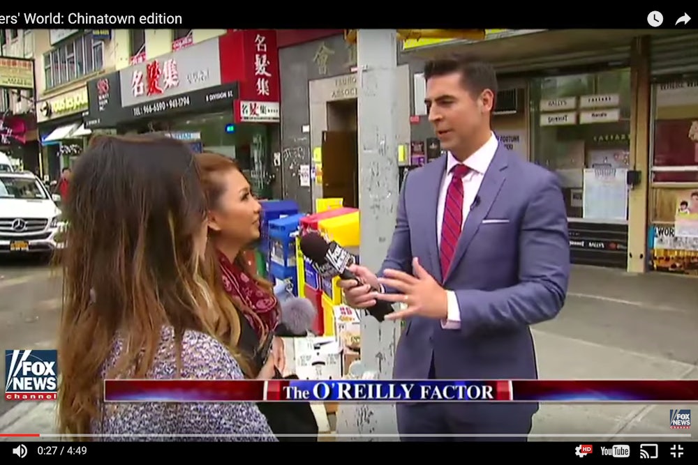 No one is having it. The O’Reilly Factor’s set-up of the segment itself made a troubling choice in linking Donald Trump’s anti-China comments in the presidential debate to New York’s Chinatown, reinforcing the stereotype that Chinese-Americans are perpetual foreigners. From there, Watters’ segment plunged into the worst tropes of cultural mockery, as he directed questions about karate and virility-enhancing herbs to passersby, mocked those who didn’t understand English, and interjected commentary like, “So China can keep ripping us off,” in response to a resident saying she would vote for Hillary Clinton.