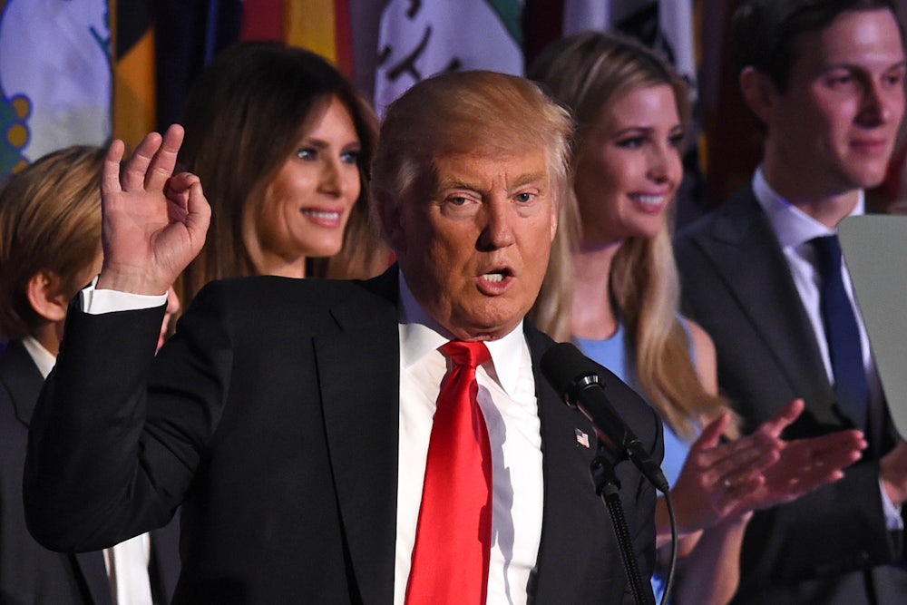 Trump began his victory speech hitting the kinds of conciliatory notes you would expect from Trump reading from a teleprompter. He praised Hillary Clinton, saying, “I congratulated her and her family on a very very hard fought campaign. She fought very hard. Hillary has worked very long and very hard over a long period of time and we owe her a major debt of gratitude for her service to our country.” The crowd, unsurprisingly, didn’t know what to do with that.
