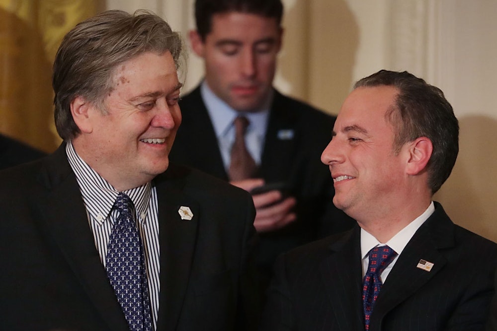 Trump’s chief strategist Steve Bannon was, of course, the former CEO of Breitbart News. So it’s easy to read the Breitbart piece as part of a power struggle between Bannon and Priebus, who have unconvincingly claimed that they get along just fine. The Bannon camp is using the Flynn scandal as cover to undermnie Priebus. And if Priebus were to be sacked or sidelined, Bannon would be able to consolidate his already powerful White House position.