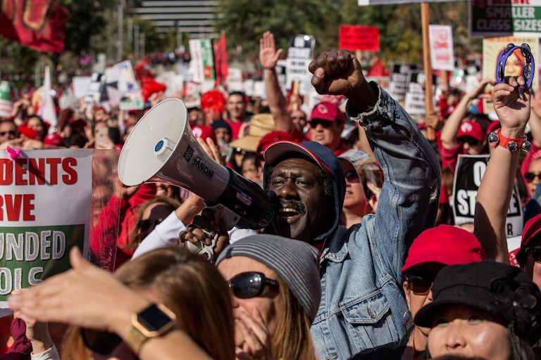 Members of United Teachers Los Angeles, or UTLA, a union representing some 35,000 teachers, are also striking in solidarity with the workers. The UTLA is separately undergoing its own contract negotiations; the union terminated its contract with the district earlier in March, so members have more freedom to stand alongside their SEIU comrades. Teachers are seeking raises of about 20 percent, and more resources to support students, including for immigrant students and high-need community schools.