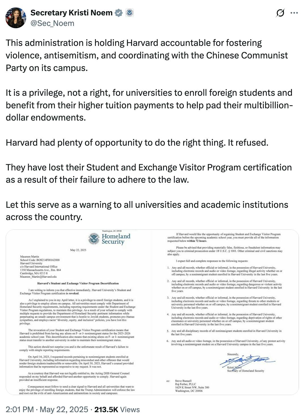 “I am writing to inform you that effective immediately, Harvard University’s Student and Exchange Visitor Program certification is revoked,” Secretary of Homeland Security Kristi Noem wrote in a letter to the institution.